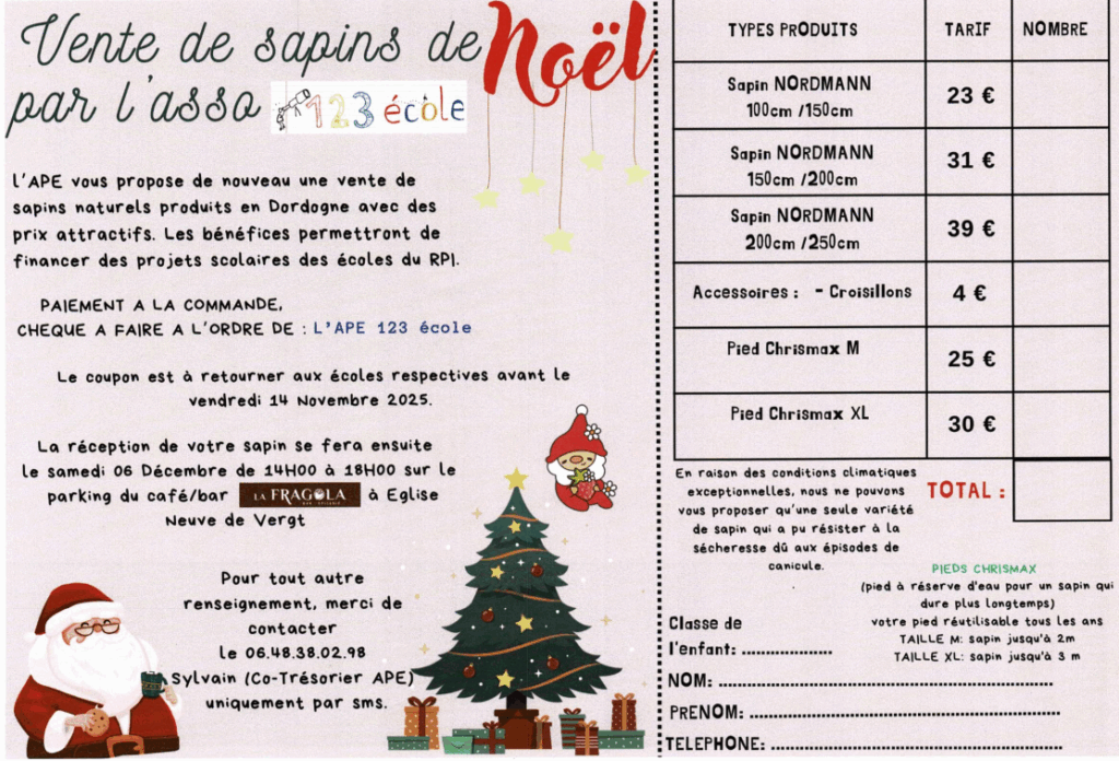 Vente de sapins de Noël – Association 123 école par mairie · 14 octobre 2025 Les bons de commandes sont disponibles en Mairie